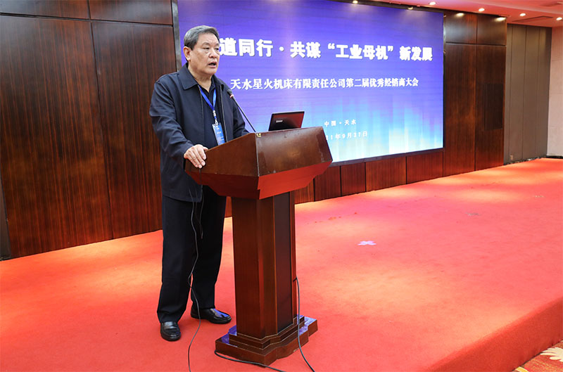 星火機床集團公司黨委書記、董事長蔣保權在大會上致辭,對各位優秀經銷商相聚天水,共謀發展表示熱烈歡迎。他向與會人員介紹了企業基本情況、近兩年發展變化、項目建設和發展規劃后說,企業與經銷商是魚水關系,也是一家人,希望大家攜起手來,共同努力,共同發展。