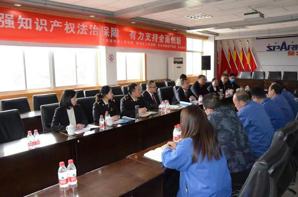 4月24日,以天水市中級人民法院民二庭庭長朱金平為組長,由天水市中級人民法院、秦州區人民法院、天水市知識產權局和天水海關有關領導和專業人員組成的服務組,在星火機床公司開展“加強知識產權法治保障,有力支持全面創新”為主題優化營商環境、支持企業全面創新服務活動,并與企業相關業務部門負責人座談。