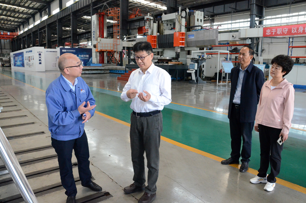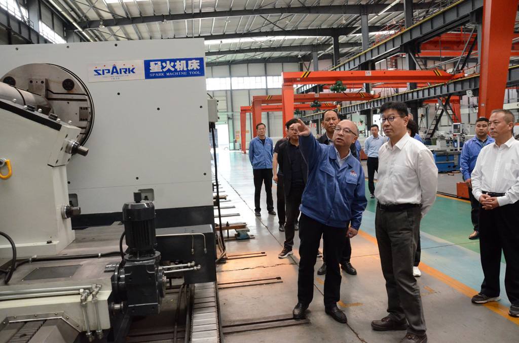 調研中,張錦剛先后參觀了星火機床公司研發的數控纏繞機床、萬能數控磨床、大型斜床身數控車床、五軸聯動數控車床,了解了重型數控車床、長規格機床的技術水平、運用行業,數控纏繞機床的生產方式、在軍品生產中的應用效果和用戶評價,以及數控產品采用的系統軟件品牌,觀看了星火職工以傳統的手工刮研方式保證產品精度的操作等。