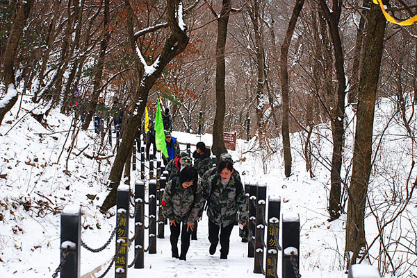 沿山繞行的臺階上覆蓋了一層薄冰和浮雪,讓大家不得不小心謹慎,聽著腳下咯吱咯吱的聲響,看著一直延伸目所不及的臺階,大家雖然疲倦之極,但他們都知道這是一次意志、毅力、體能的極限考驗,雖然有的同志體力不支,依然互相鼓勵、相互攙扶,一步一步向山頂行進。