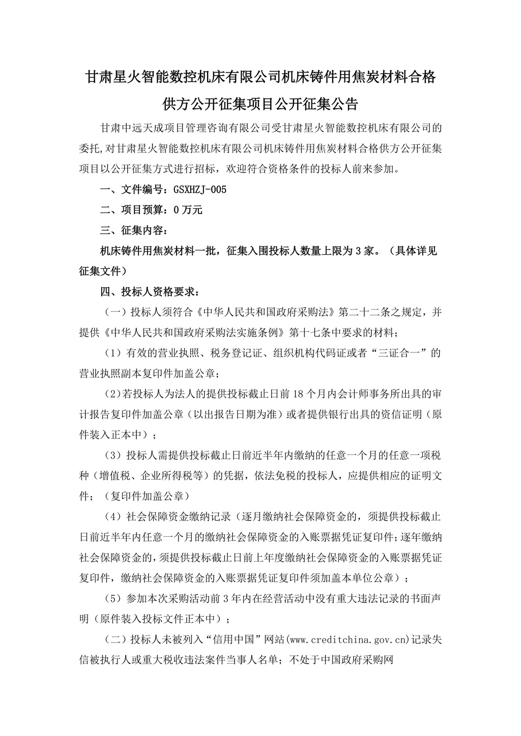 甘肅星火智能數(shù)控機(jī)床有限公司機(jī)床鑄件用焦炭材料合格供方公開征集項(xiàng)目公開征集公告